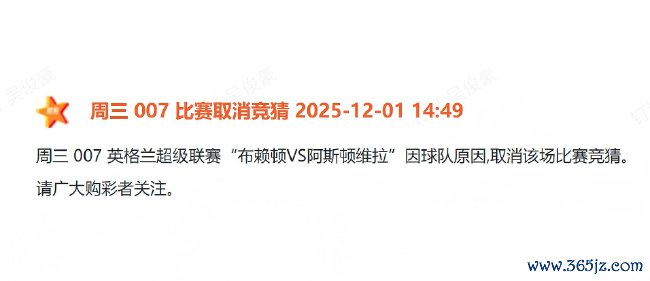 对此,中国体彩也飞速作出响应。本周三布莱顿VS阿斯顿维拉的英超比赛蓝本已插足竞彩赛程,但由于布莱顿俱乐部发布的“无耻本色”,当今中国体彩已取消这场比赛的竞猜。此外由于足彩第25178期已于11月30日晚开售,无法再转变赛程,因此布莱顿VS阿斯顿维拉的比赛得以保留。不外字据12月2日体彩官方最新发布的12月5日-11日足彩赛程中,布莱顿也曾被摒弃在外,这也符号着布莱顿追究被中国体彩剔除出竞猜序列。